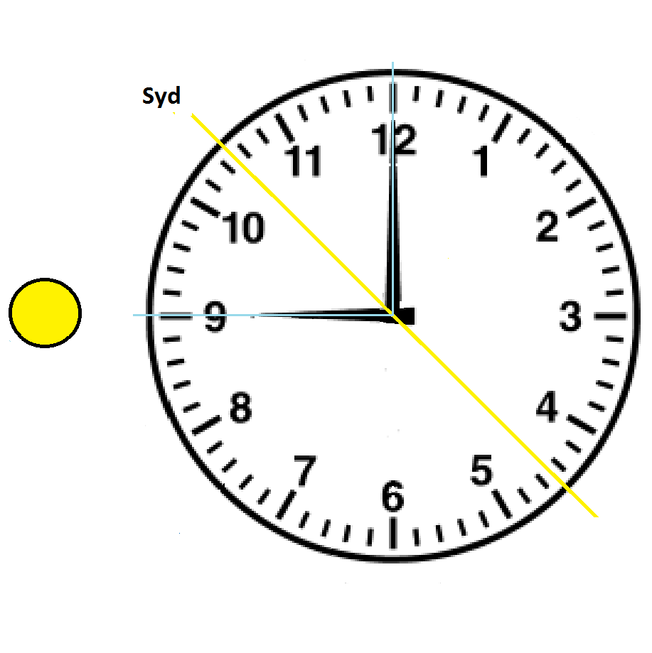 Er klokken mellem 12 midnat og kl. 12 middag så er vinkelhalveringslinjen mellem timeviseren og kl. 12 på urskiven syd, når man går i urets retning fra timeviseren til 12.