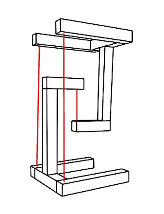 Her ses en model. De røde streger er reb. Hvor overdelen hænger i rebet i midten og stabiliseres af de to andre reb. Så længe strukturen ikke påvirkes fysisk og de tre reb er spændt ud er strukturen stabil.
