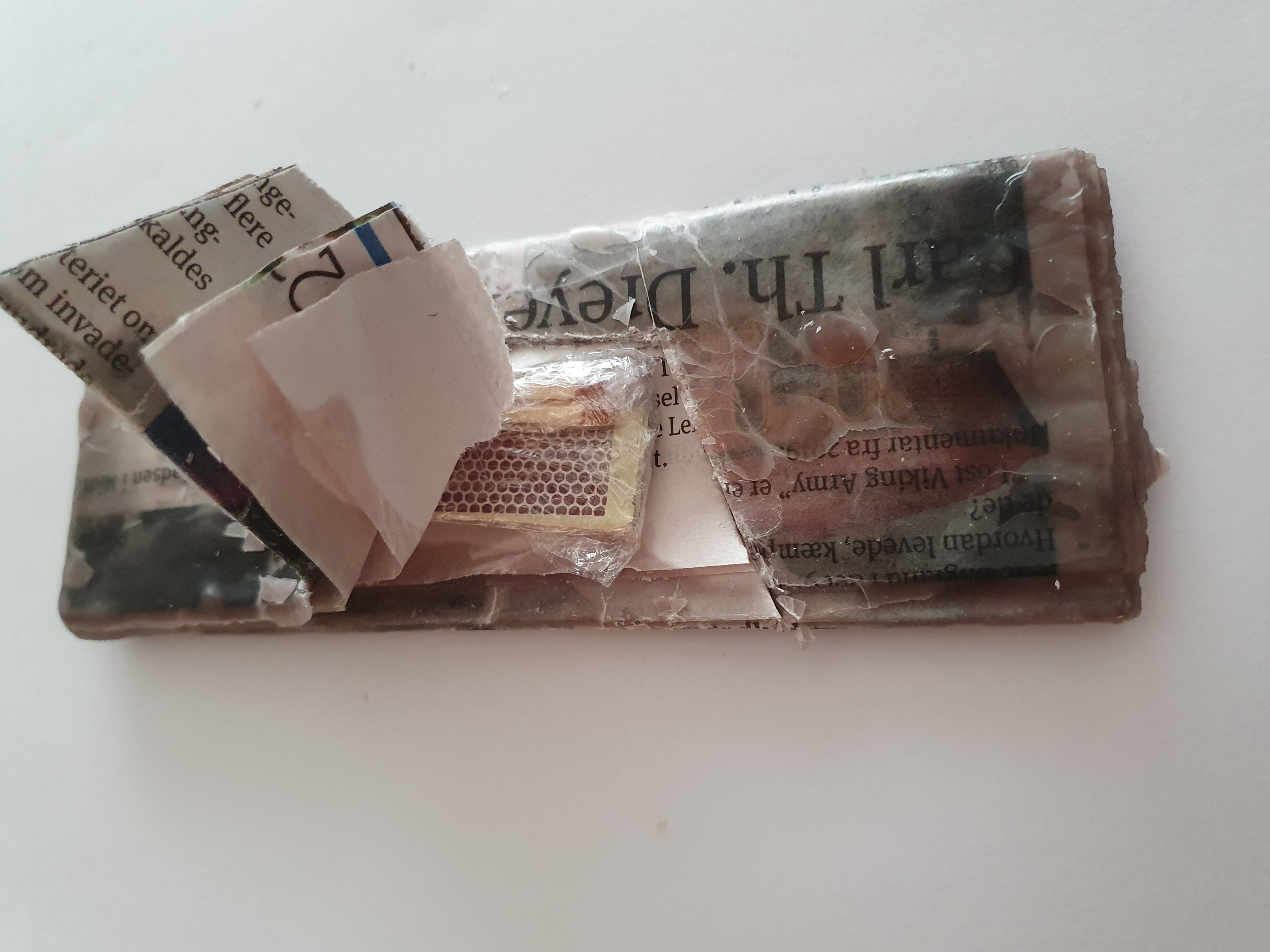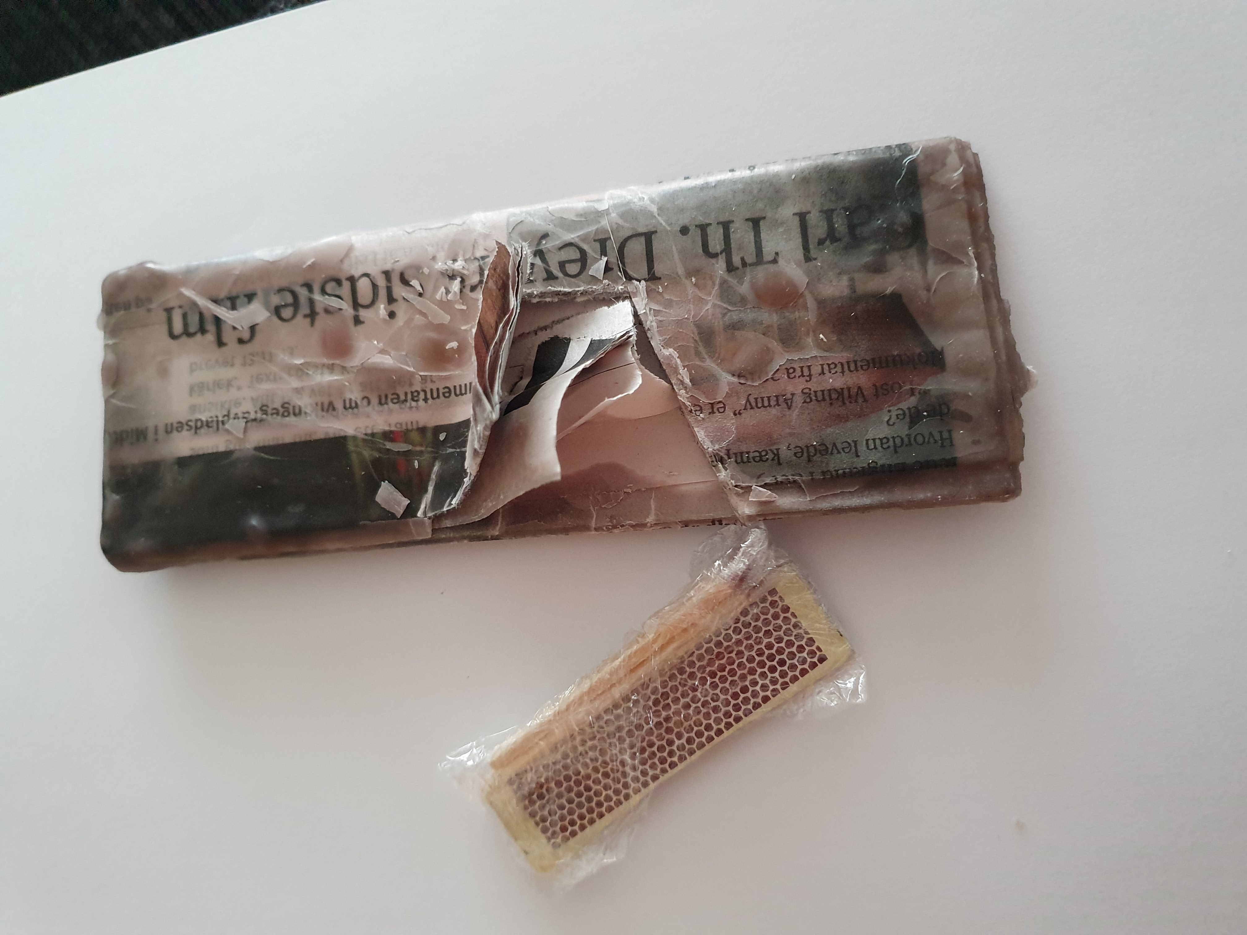Et stykke svovl fra en tændstikæske og nogle tændstikker pakkes ind et et lille stykke vitavrap. svovl og tændstikker foldes ind i avispapir, så det fremstår som en lille pakke i dankortstørrelse. "kortet" dyppes i stearinen. En velegnet løsning til spejderen som skal på tur.