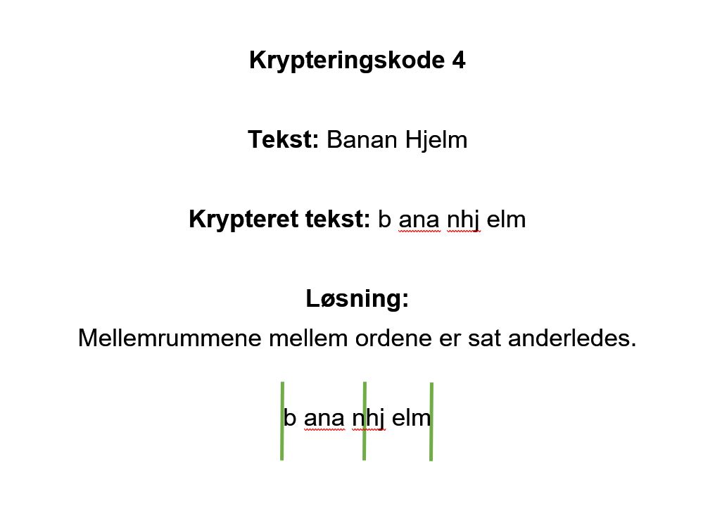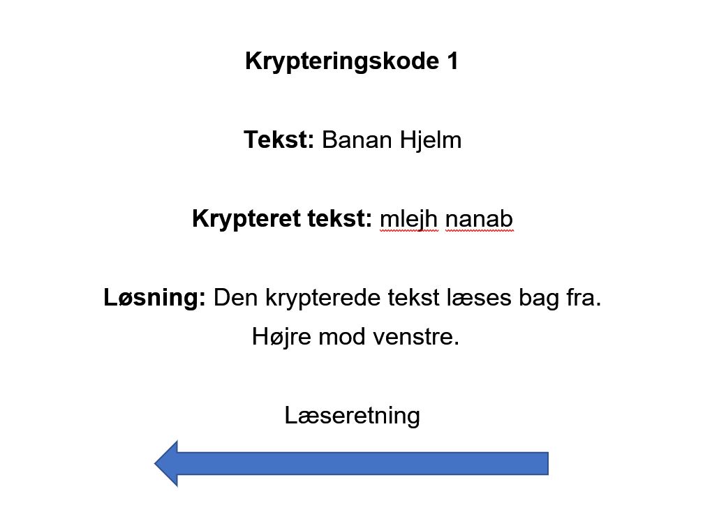 Deltagerne lærer et antal måder koderne i spillet kan krypteres på. Der laves en række koder med disse simple krypteringer. Brug krypteringerne som i de forrige eksempler evt. med små variationer. Alle deltager trækker et kort. Når de har løst deres kode. Så ligger de deres kort på pladen der hvor løsningen står til deres kode. De trækker nu et nyt kort.